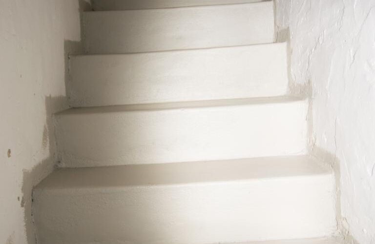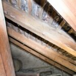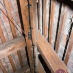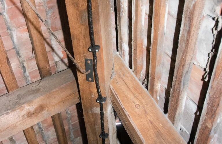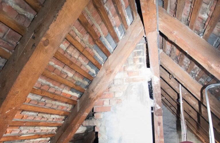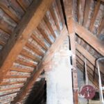 Über eine schmale Holztreppe gelangen sie zum Dachboden. Dieser ist nicht ausgebaut.