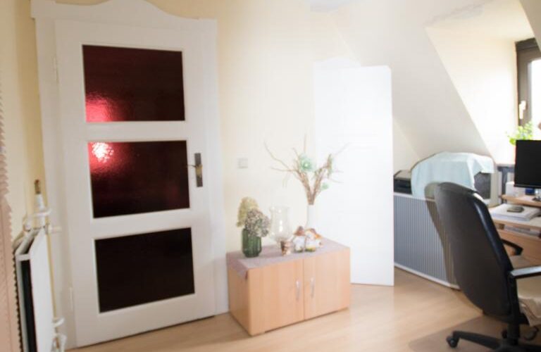 Im Dachgeschoss ist die Diele (Arbeitszimmer/ Büro) zentral gelegen und bietet einen Blick in den Garten. Seitlich ist eine Abstellkammer ausgebaut und sehr gut als Stauraum nutzbar. Mittig gehen Sie in das helle geräumige Schlafzimmer mit Zugang zu einer weiteren ausgebauten Abstellkammer. Das Kinderzimmer oder Gästezimmer hat einen guten Zuschnitt und ist zur Straße ausgerichtet.
