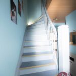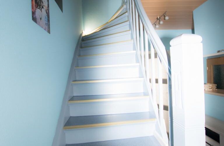 Eine Holztreppe führt zum Dachgeschoss und zum Dachboden.