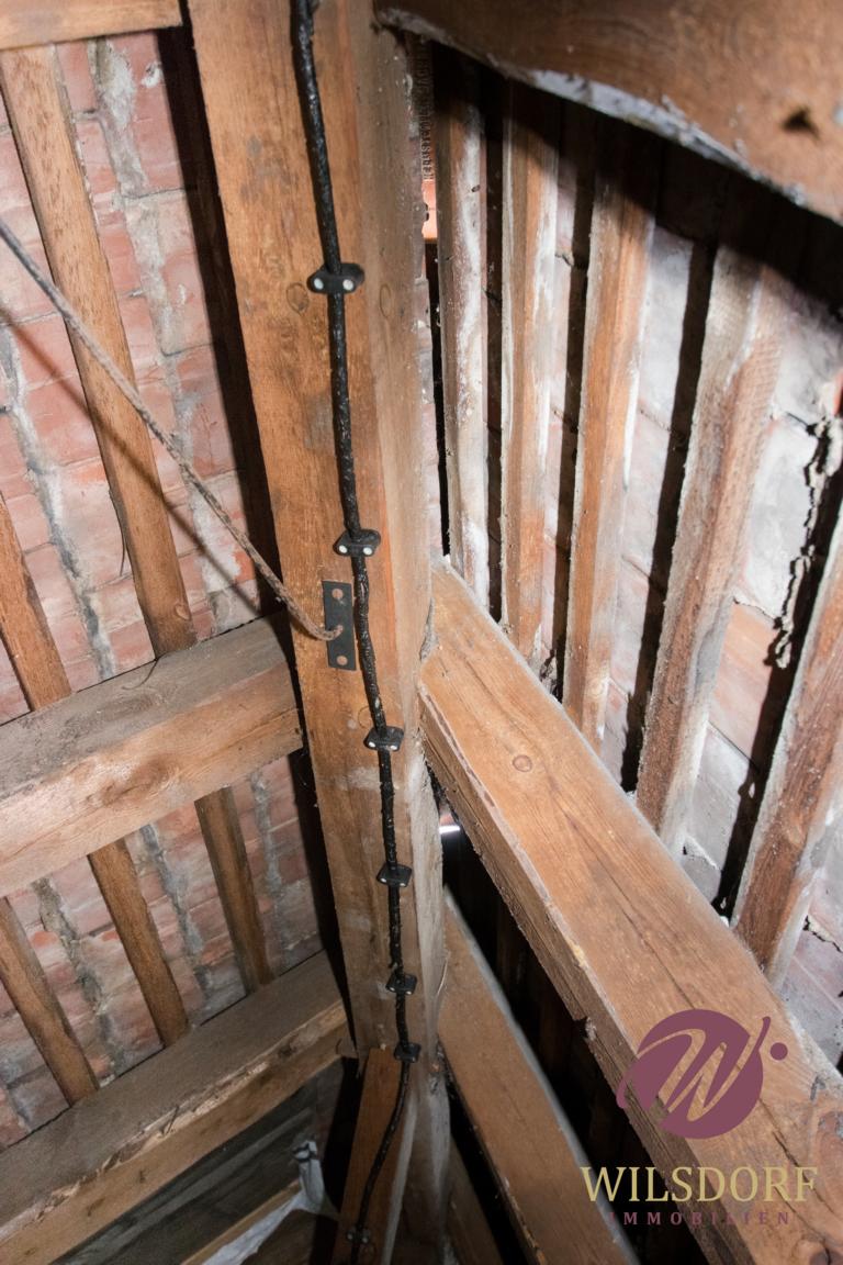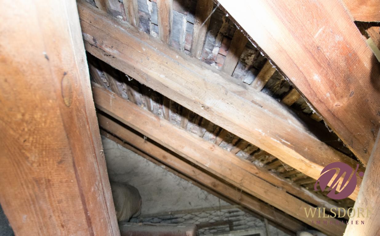 Über eine schmale Holztreppe gelangen sie zum Dachboden. Dieser ist nicht ausgebaut.