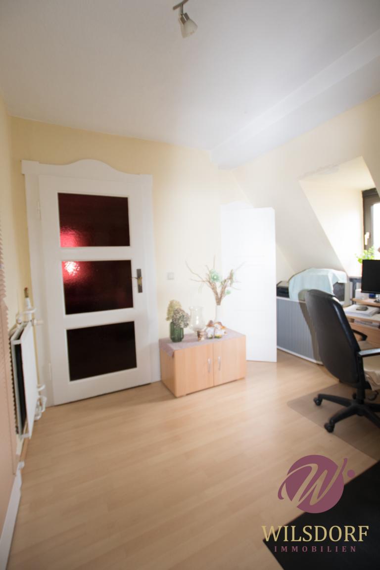 Im Dachgeschoss ist die Diele (Arbeitszimmer/ Büro) zentral gelegen und bietet einen Blick in den Garten. Seitlich ist eine Abstellkammer ausgebaut und sehr gut als Stauraum nutzbar. Mittig gehen Sie in das helle geräumige Schlafzimmer mit Zugang zu einer weiteren ausgebauten Abstellkammer. Das Kinderzimmer oder Gästezimmer hat einen guten Zuschnitt und ist zur Straße ausgerichtet.