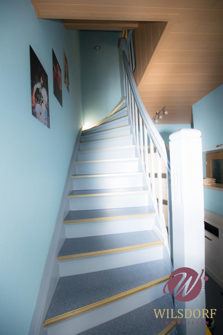 Eine Holztreppe führt zum Dachgeschoss und zum Dachboden.